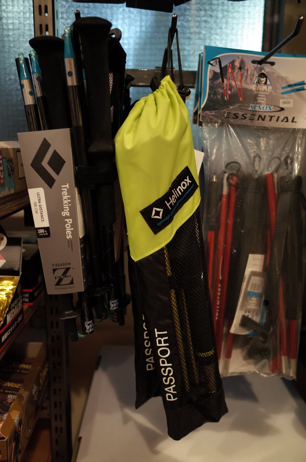 トレランポール類も入荷しました。左から、超軽量カーボンポールの定番、Black Diamond/Ultra Distance(110cmペアで285g ¥15,120-)、軽量性・強度のとれたアルミポールHelinox/PASSPORT(115cmペアで312g ¥11,550-)、超軽量かつコンパクトなコスパの良いアルミポールCAMP/XENON4(110cmペアで250g ¥9,450)です。